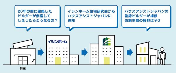 イシンホームでは、加盟店が廃業や倒産した場合でも、保証期間内であれば第三者保証機関である「ハウスアシストジャパン」が責任を引き継いで対応してくれます。